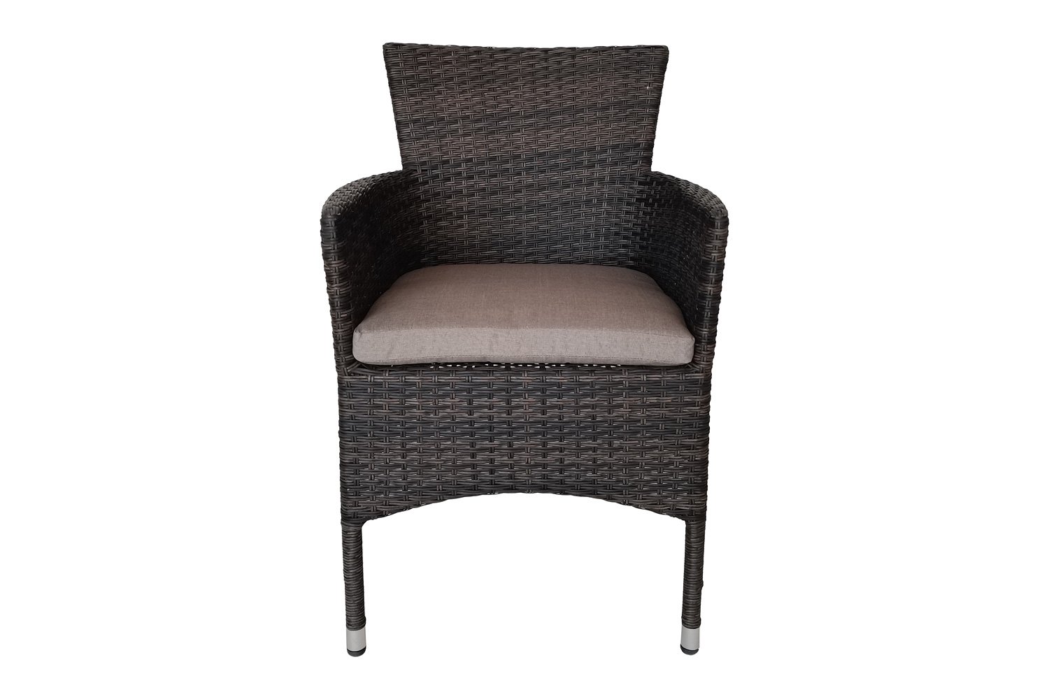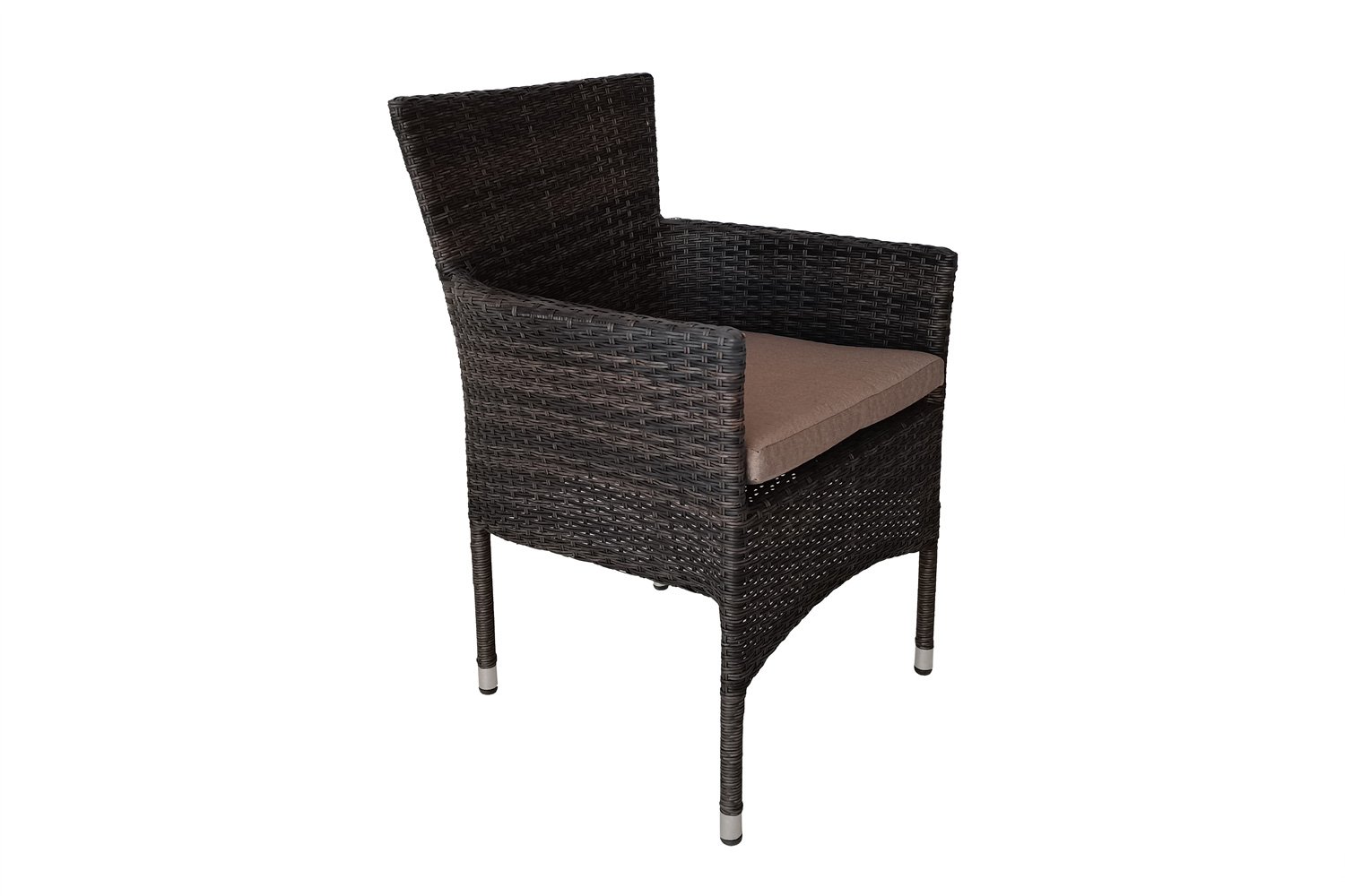 У кресла есть небольшая спинка и узкие подлокотники, которых достаточно для комфортного размещения. Размеры кресла 57х89х61 см, цвет каркаса черный, цвет оплетки коричневый (YJ1768-1). Каркас состоит из стали, оплетка представляет собой переплетение искусственного ротанга. Кресло выдерживает перепад температур в пределах от 0 до +45 градусов, и максимальную нагрузку до 120 кг.