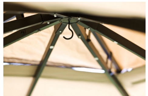 Крыша крепиться к каркасу садового шатра 3x4м с помощью специальных креплений из прочной долговечной стали и липучек. В результате получается цельная конструкция - павильон.