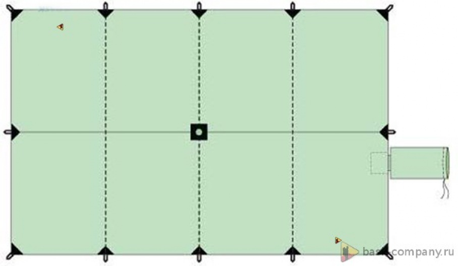 Туристический тент 6х6 - укрытие для стоянки большой площади. В центре тента имеется карман для стойки. Форма и конструкция кармана позволяют использовать в качестве стойки байдарочное весло или стойку, изготовленную из подручных средств.